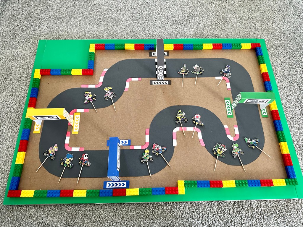 Next I glued a piece of brown posterboard to the white foam board using spray adhesive, and then glued the track to the brown posterboard with white glue. After this I created a rainbow border by hot gluing together a bunch of off-brand legos I found on Amazon. I used this border to measure out the shape of the grass, and cut the “grass” border out of green posterboard. I hot glued the grass to the board, and then hot glued the lego border on top of all of that. I also glued a little checkered finish line to the track.