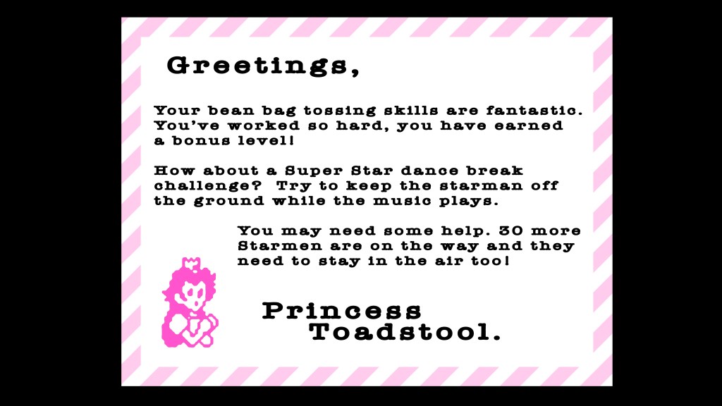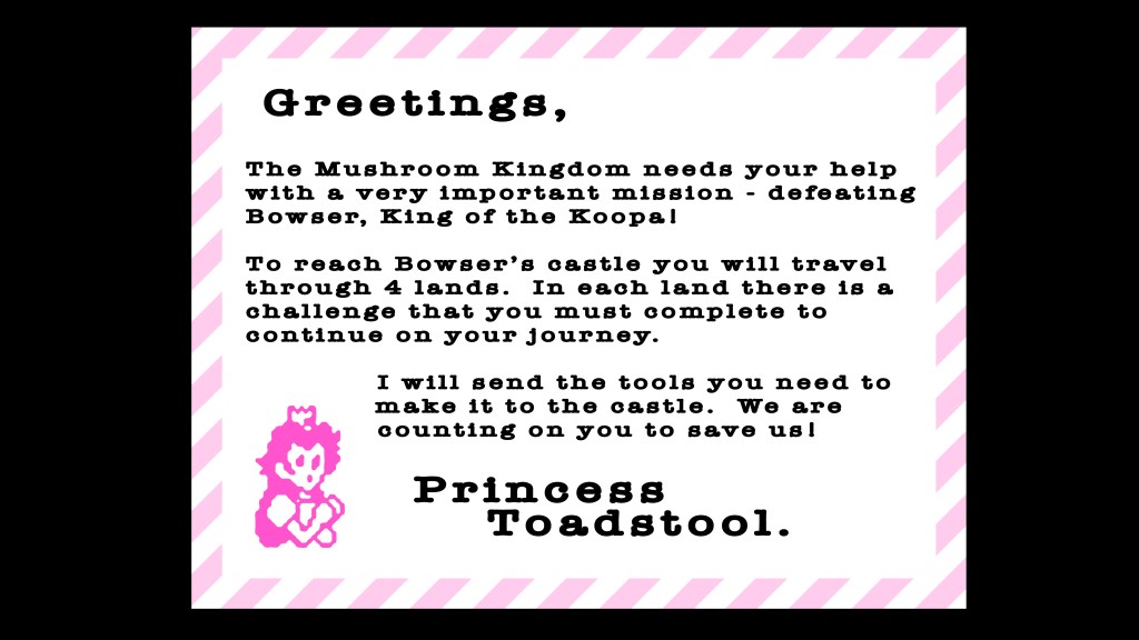 After photos, we started the Super Mario 3 quest with the first letter from the princess. For each letter from the princess, I had both a physical copy printed and it was also displayed on the television as we read the physical copy.