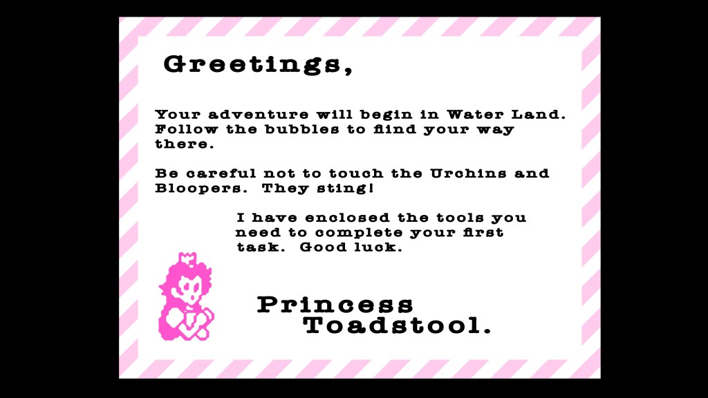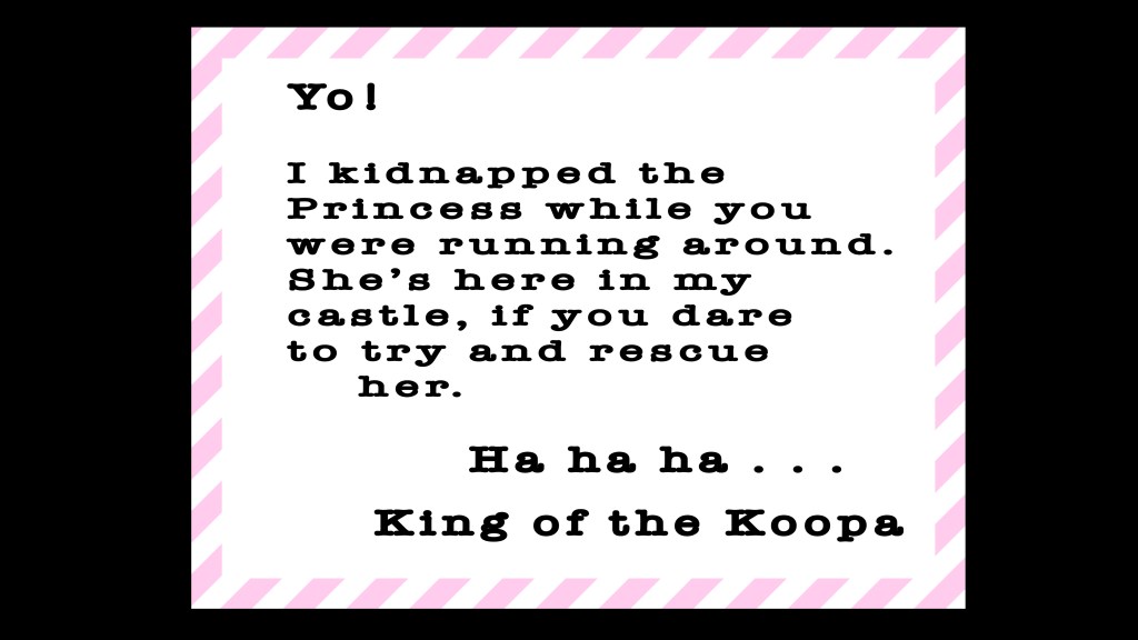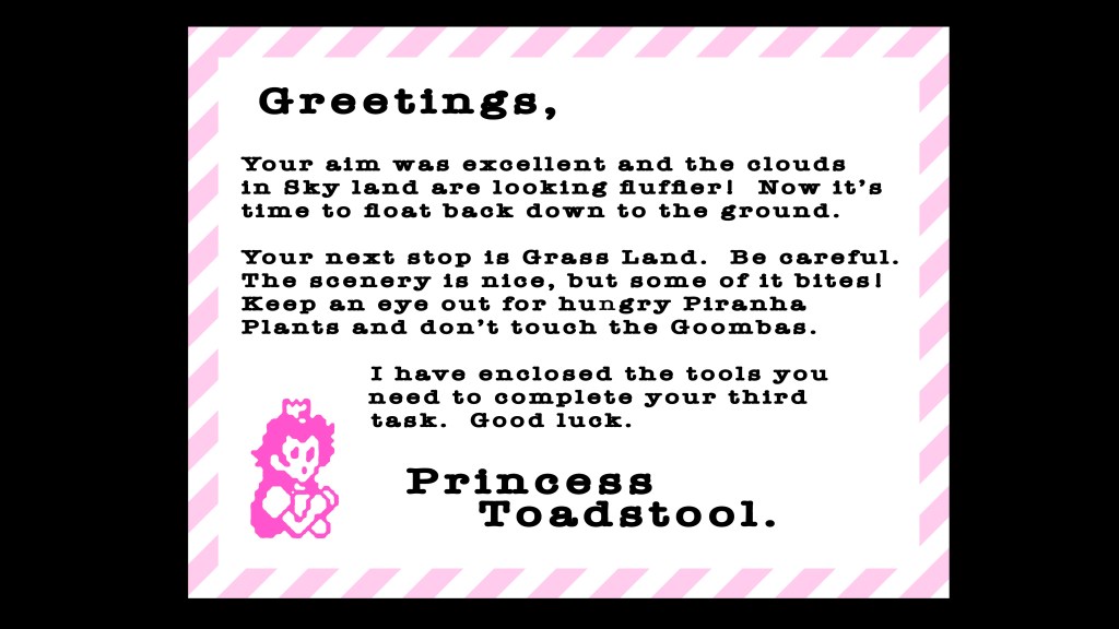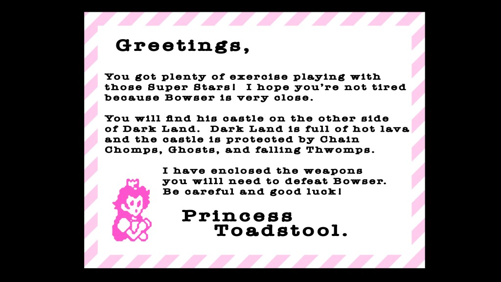 The trail ended at a letter hanging on the wall. This is an actual letter from Super Mario 3, copied word for word!