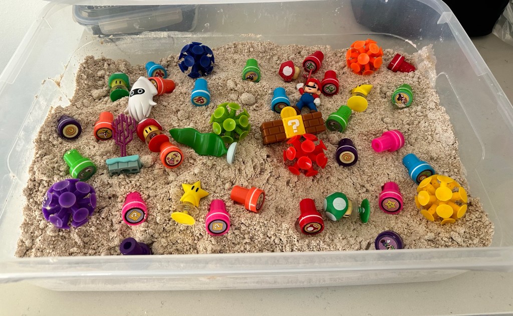 After reading the first letter, I pulled out the first question block for Noah to punch open. He *LOVED* being Mario and punching open the blocks. Inside the first block was about 80 coins that fell all over him, some sand toys (little shovels, rakes, etc), and the next letter from the Princess.