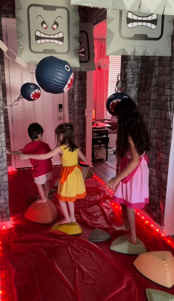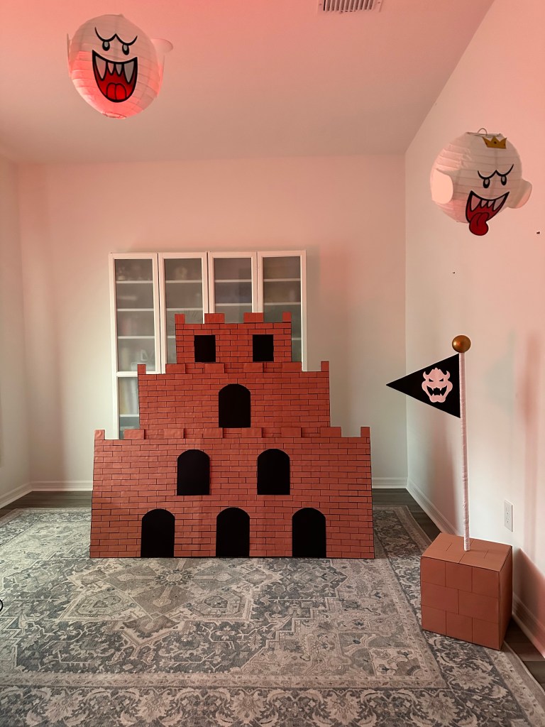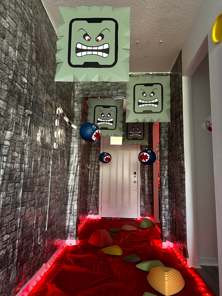 Dark Land was my favorite area to create. The walls were covered with plastic with a castle brick pattern. The floors were covered in red plastic tablecloths and surrounded by red LED lights. Stepping stones made a path from one end to the other. 4 Thwomps, 3 Chain Chomps, and 3 Boos hung from the ceiling. The stepping stone trail led to Bowser’s castle itself.