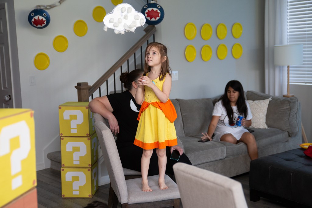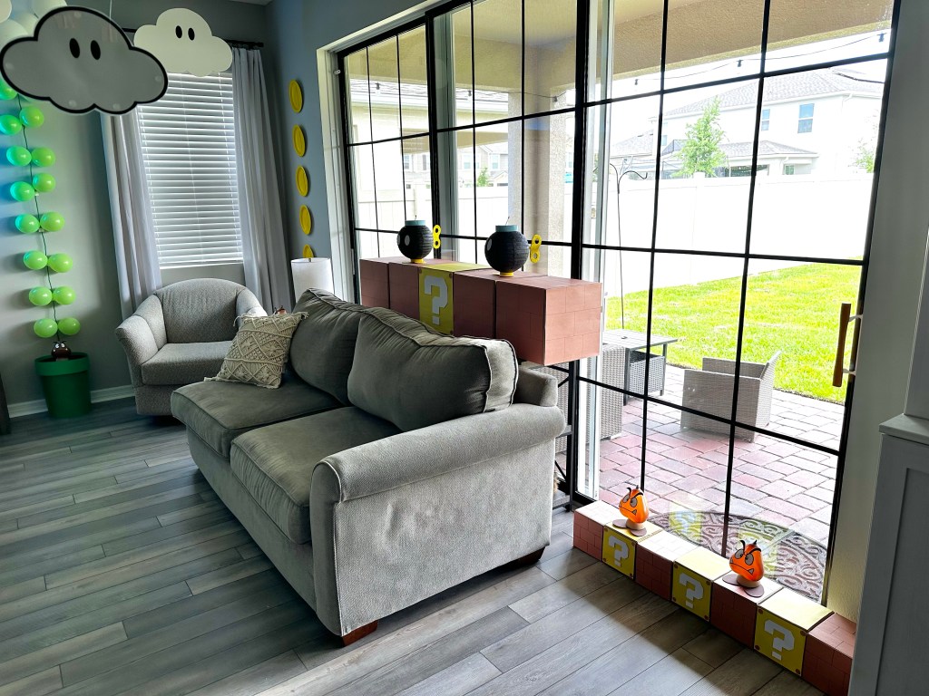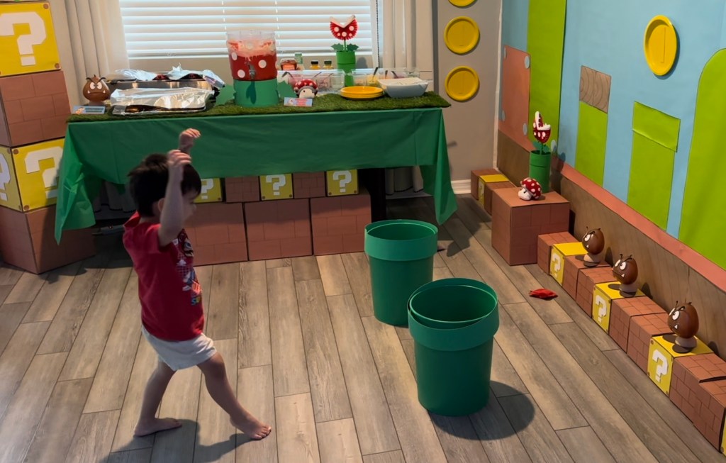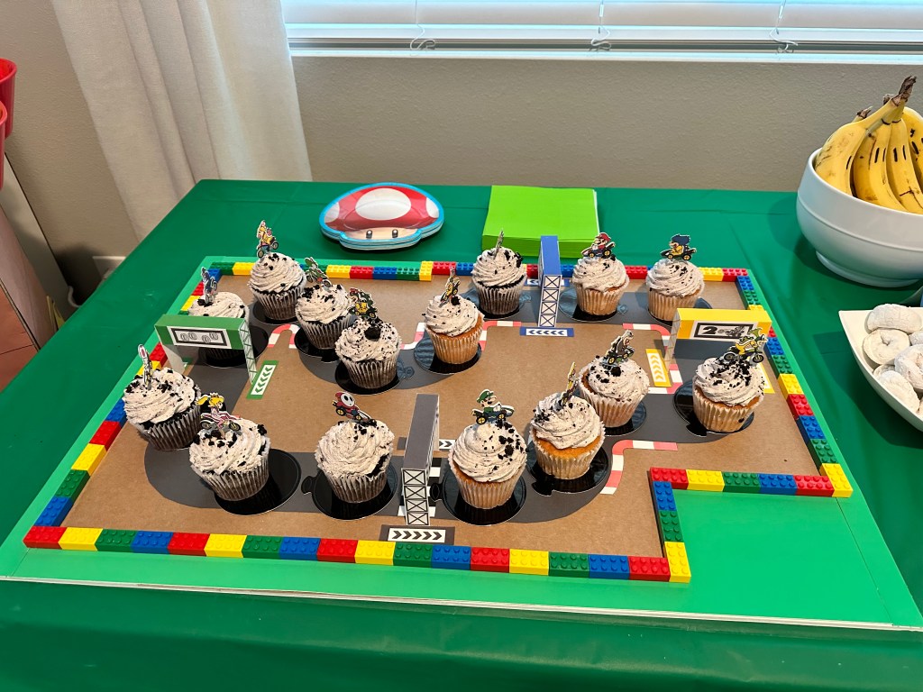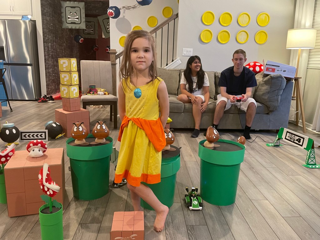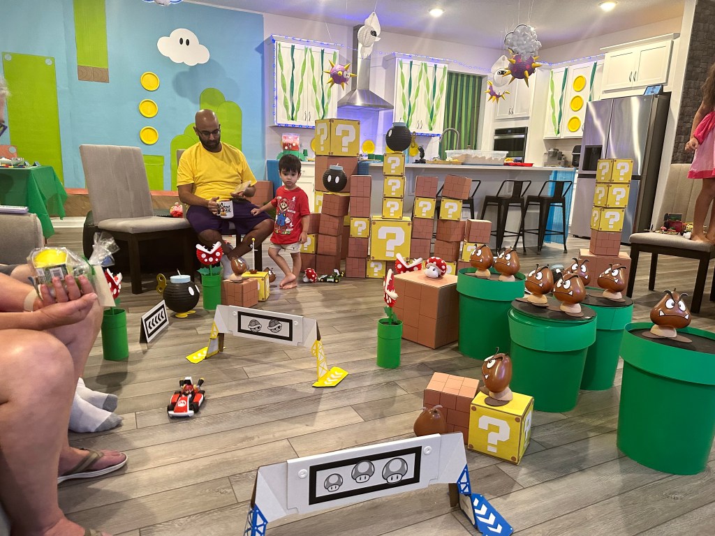 The final part of the party was a sort of free play part. We set up a Mario Kart Live home cricut track and all the loose party decor was used to decorate the track. My 5 year old daughter was super into this and did most of the decorating herself while everyone else took turns driving the cars around. This is how wild of a setup she made!