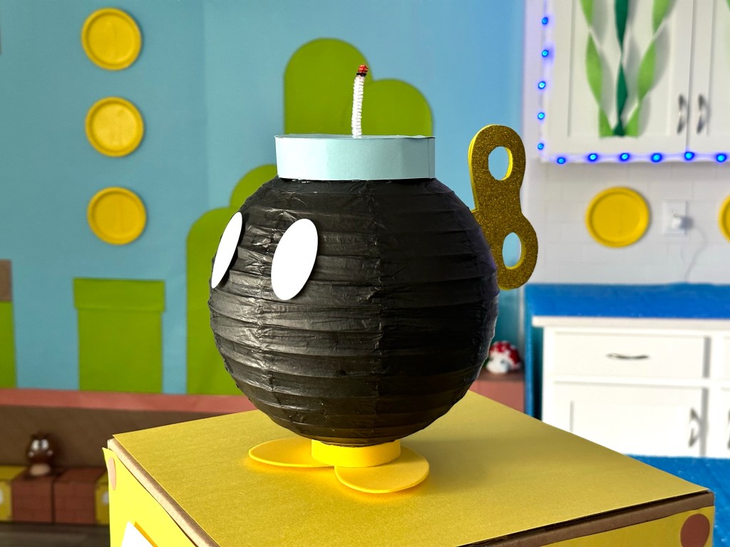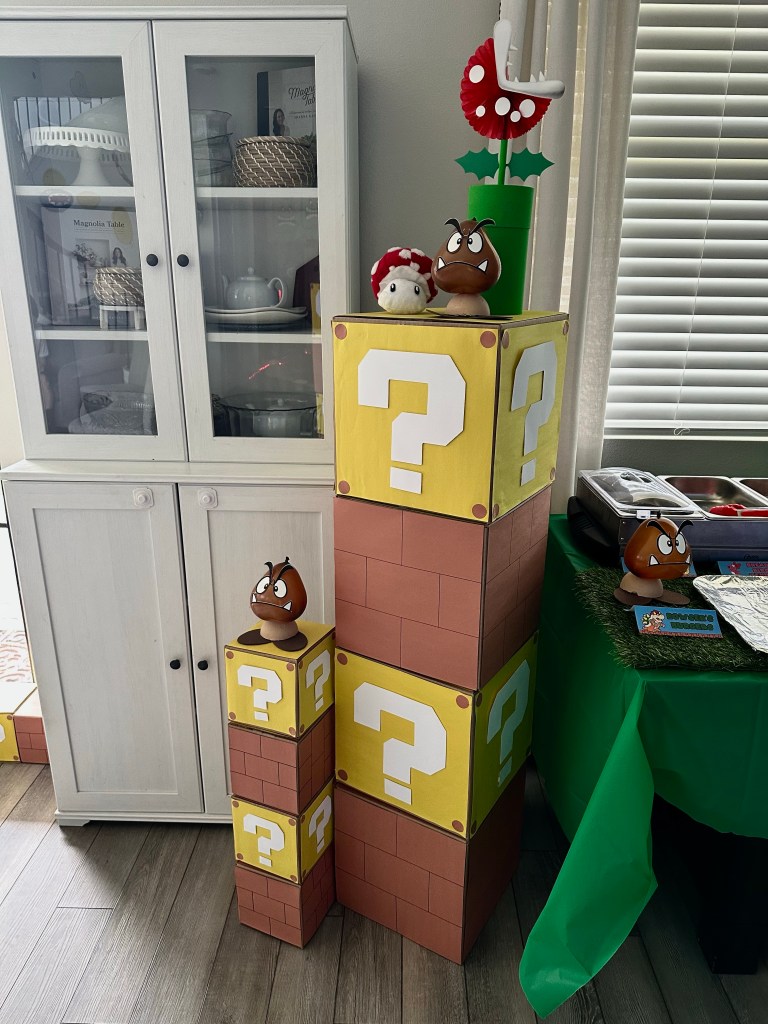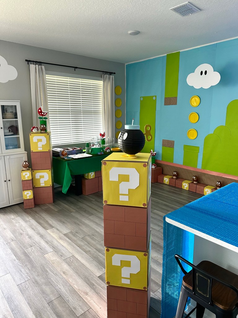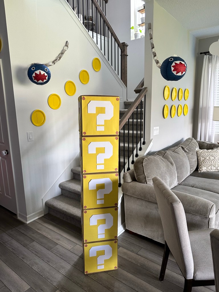 I started with a cloud / balloon sculpture hanging from the ceiling. Then 2 balloon vines made from pipe cleaners coming down from the clouds. The vines each end in warp pipes. I hung 4 foam board clouds from the ceiling plus 3 smaller contact paper clouds that were used in the second challenge. The rest of the space I decorated with brick and question blocks, coins, Bob-ombs, and Goombas. I also set my TV backlight to blue for more of a sky effect. The TV played a slideshow throughout the party that was relevant to whatever activity we were doing. Off to the side I had a couple chain chomps, and also the stack of 5 interactive question mark punch blocks that were used during the party.