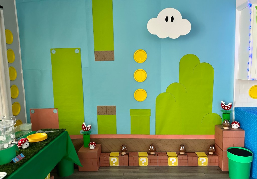 The feature in Grass Land was the paper mural I created and hung on the wall. I also used warp pipes, Piranha Plants, mushrooms, Goombas, coins, a cloud, brick/question blocks, and a Bob-omb in this space.