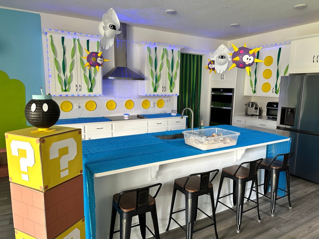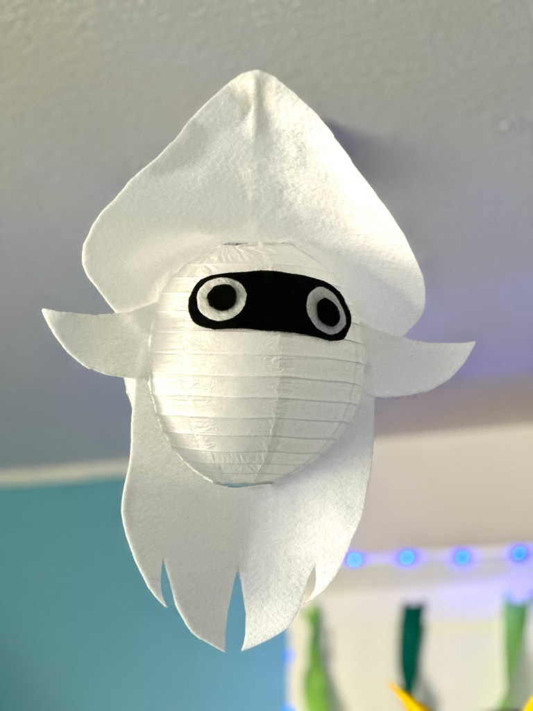 The counters were covered in blue bubble wrap. Everyone LOVED popping it throughout the party! Sea plants were made from streamers and hung from the cabinets (I loved how they turned out so much!). The cabinets were highlighted with blue LED lights. I had an ocean projector on the counter that projected ocean waves on the ceiling (hard to see in the daylight when this photo was taken). There’s also a bubble machine on the counter which was turned on when the kids visited Water Land. The urchins and bloopers were hung from the ceiling with fishing line. Empty space was filled with paper plate coins. And finally, the bin on the counter is a sand treasure hunt activity (more on that later).