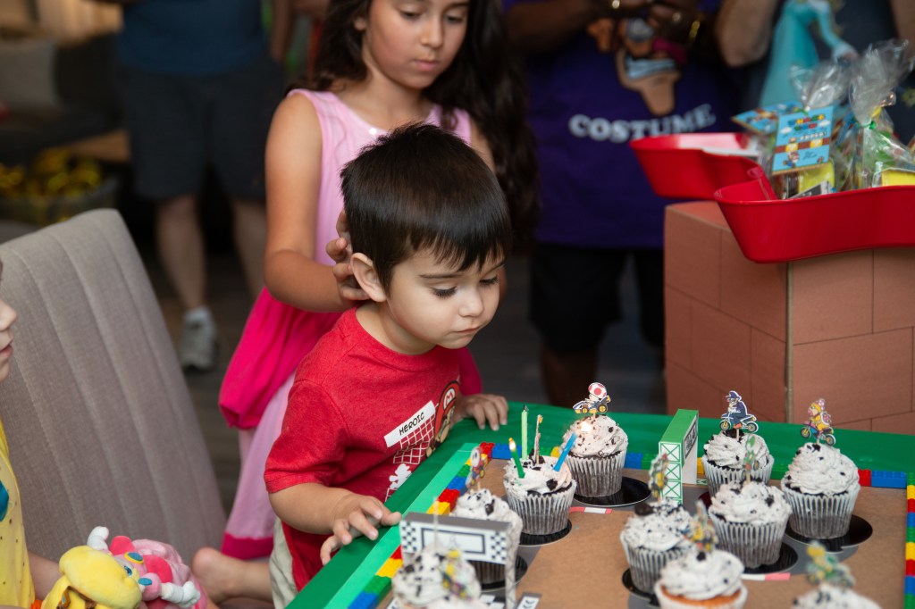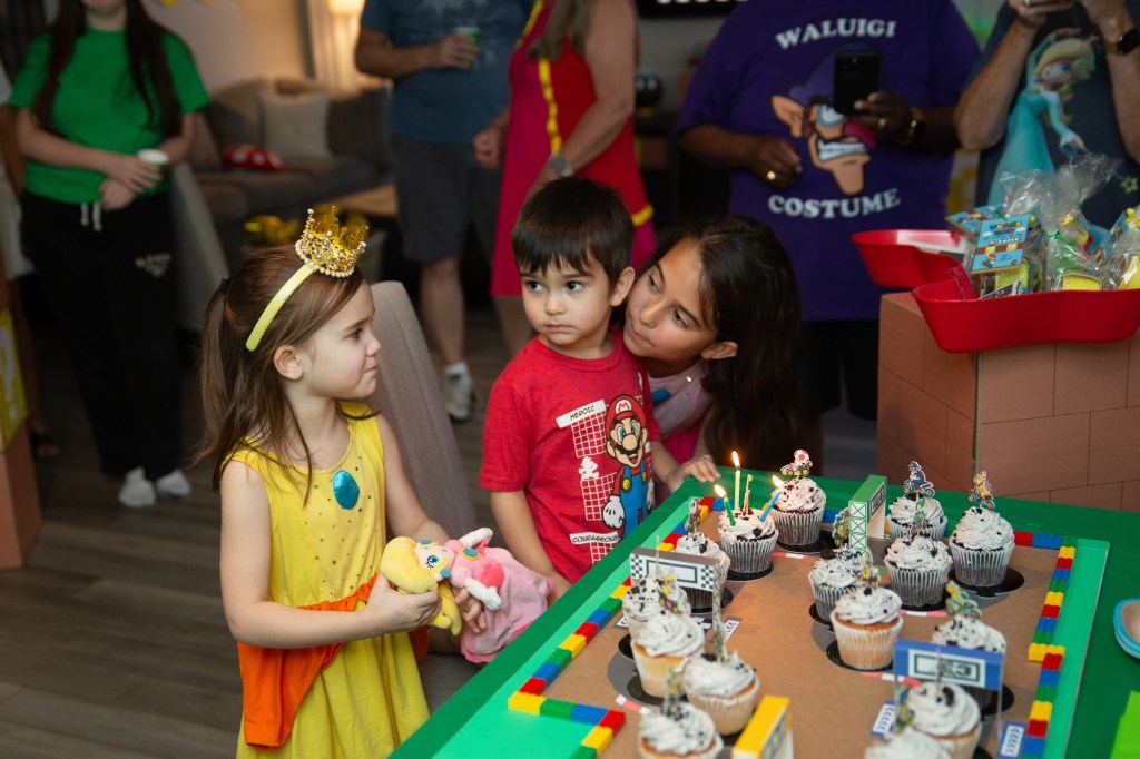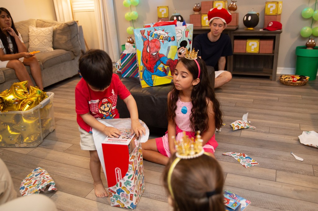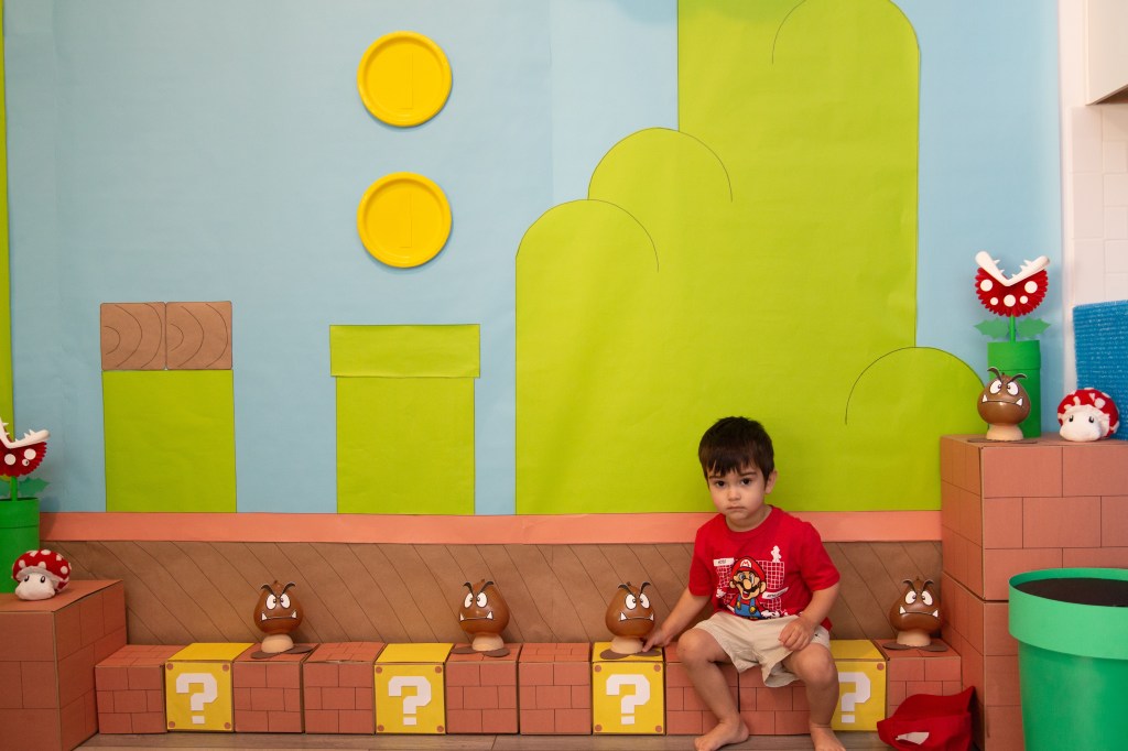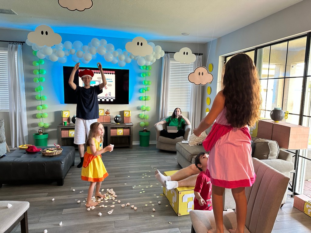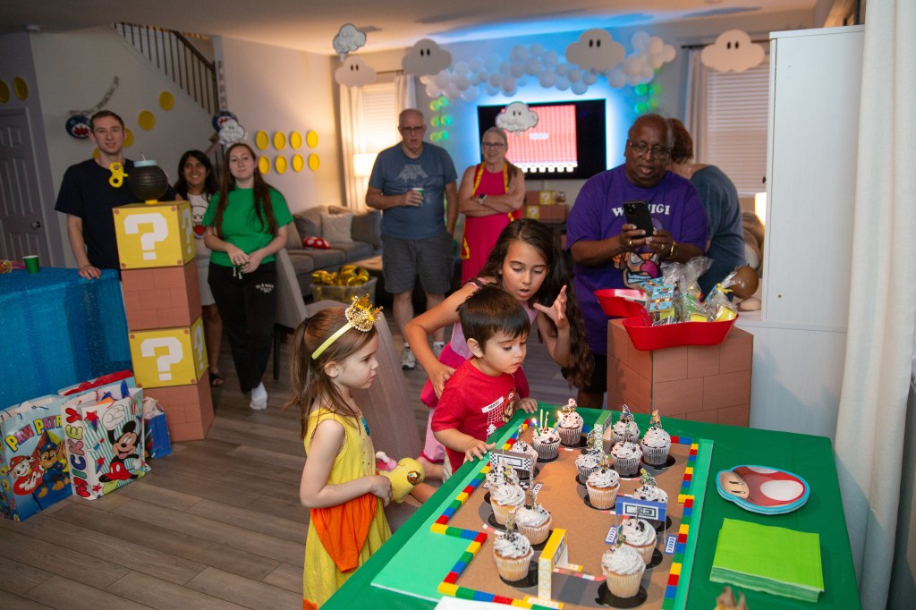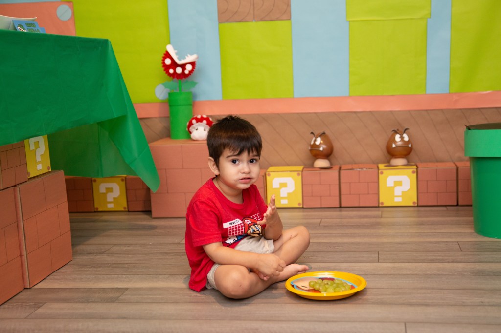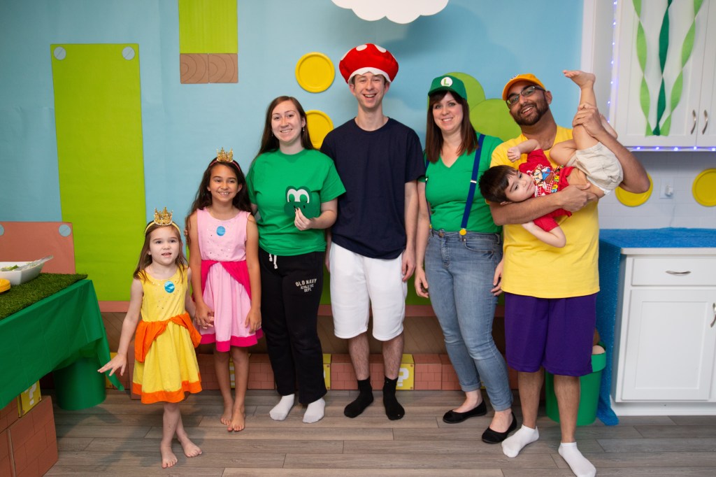 The party’s start time was 6:00 p.m. And dinner was served at 6:05 when the final guest arrived. At 6:30 everyone was done eating so we took a few group photos. The birthday boy was not in a group photo sort of mood so it made for some interesting pictures. He also didn’t want to wear his Mario costume. We expected that, so we bought him a Mario t-shirt as a backup and he wore that instead.