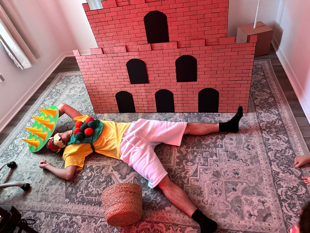 Bowser was wearing a Velcro vest, and the balls the kids received from the mystery block just happened to stick to his vest (thank you, Ikea!). They chased him around the room throwing balls at him until all the balls were stuck to him. Then Bowser was defeated, and Princess Peach was free again!