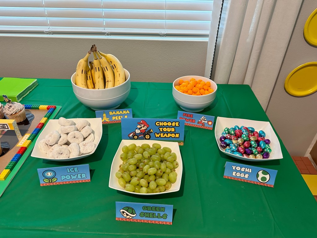 At this point in the party, I occupied the kids and the guests by tasking them with the cleanup of 400 plastic coins and 30 Mylar star balloons that were scattered all over Sky Land. While they did this, I emptied the food table and replaced all the teams with Mario Kart themed items.