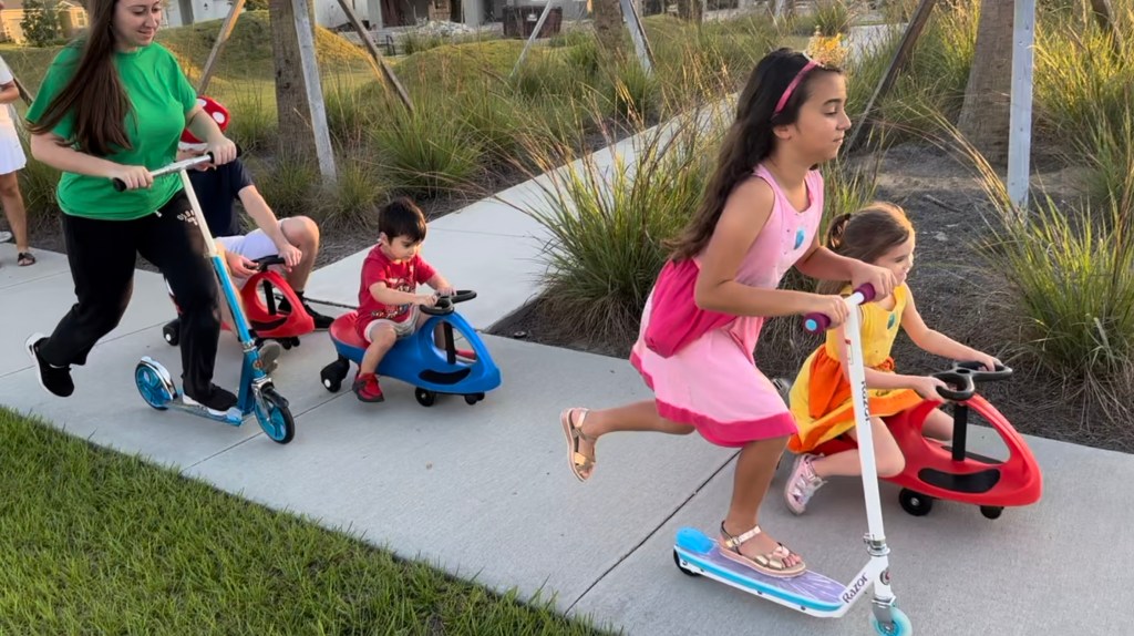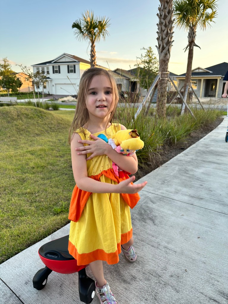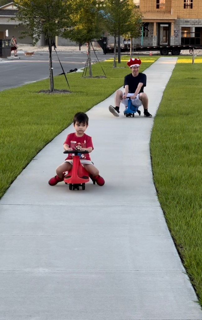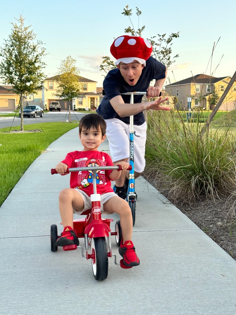 Then we all grabbed some ride-on toys from the garage and headed across the street to have a Mario Kart race around the park. It was pretty funny to be out “in public” with our Mario costumes but we didn’t bump into too many neighbors, thankfully.