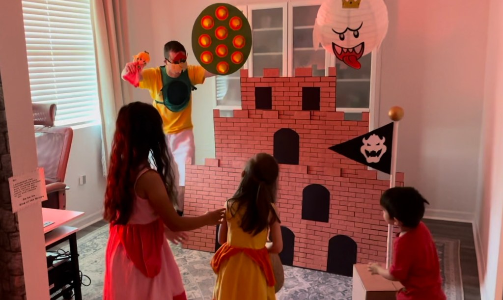 At this point I turned on some dance party lights and dumped a whole bin of Mylar star balloons on the kids. They played keep it up with the balloons for 3 minutes. (This gave Toad a chance to transform into Bowser when they weren’t looking.)